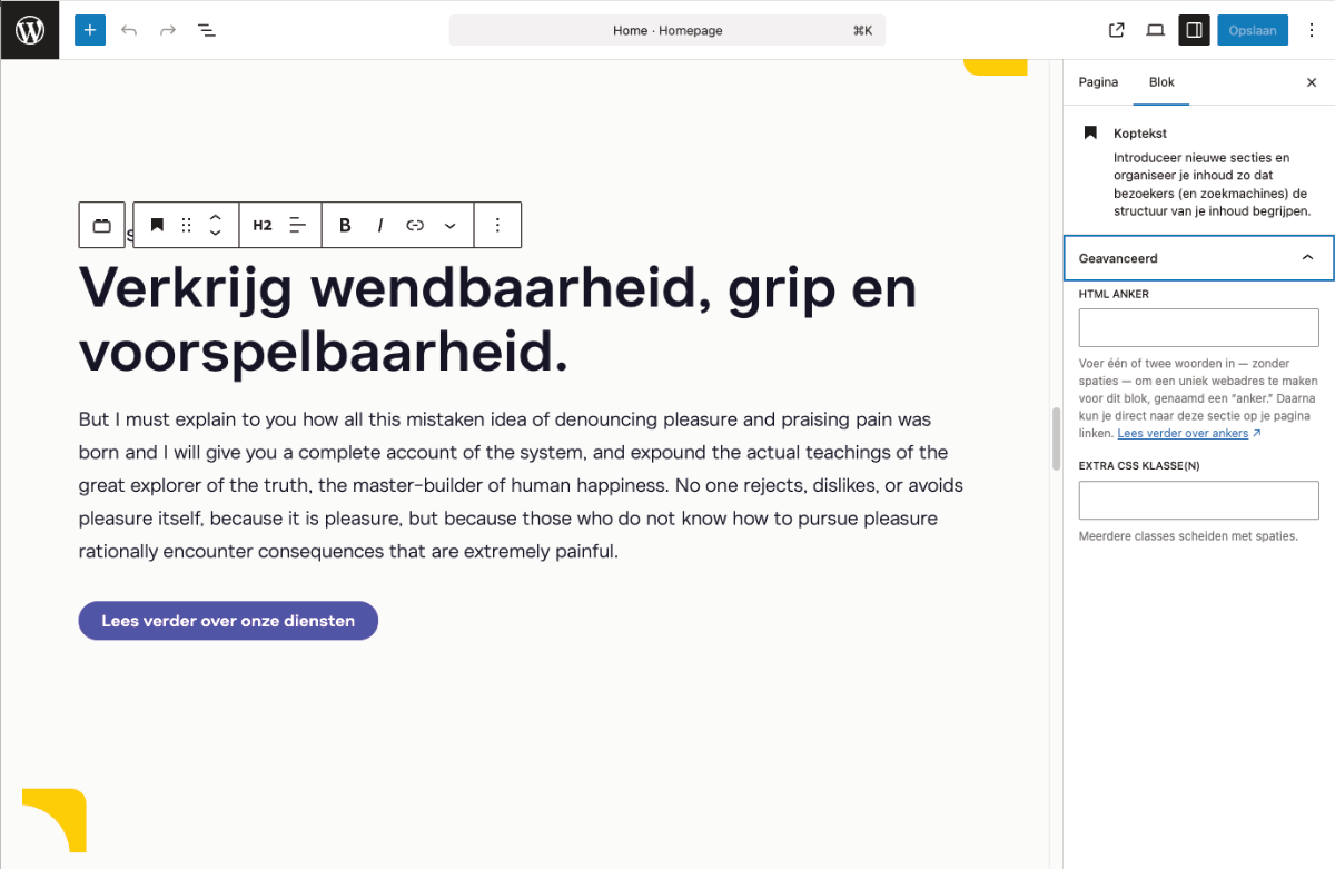 In WordPress wordt de inhoud van pagina’s en berichten opgebouwd met zogenaamde “blocks” — losse bouwstenen voor tekst, afbeeldingen, kolommen, knoppen, video’s en meer. Dit systeem heet Gutenberg.